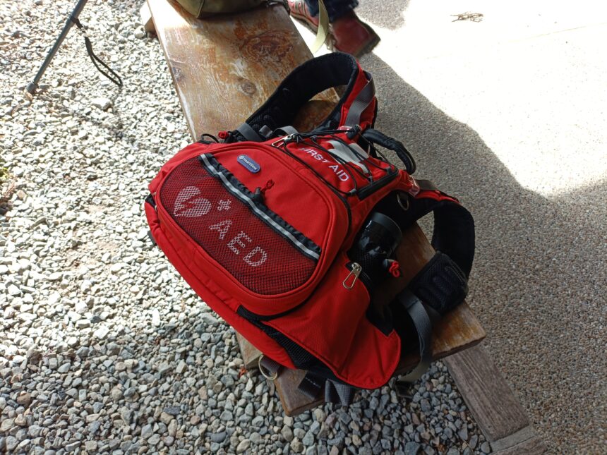 ガイドさんの持ち物の中には、AEDのリュックサックがありました。