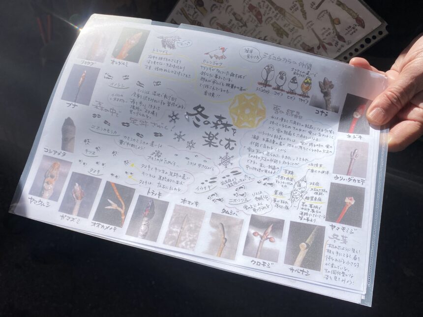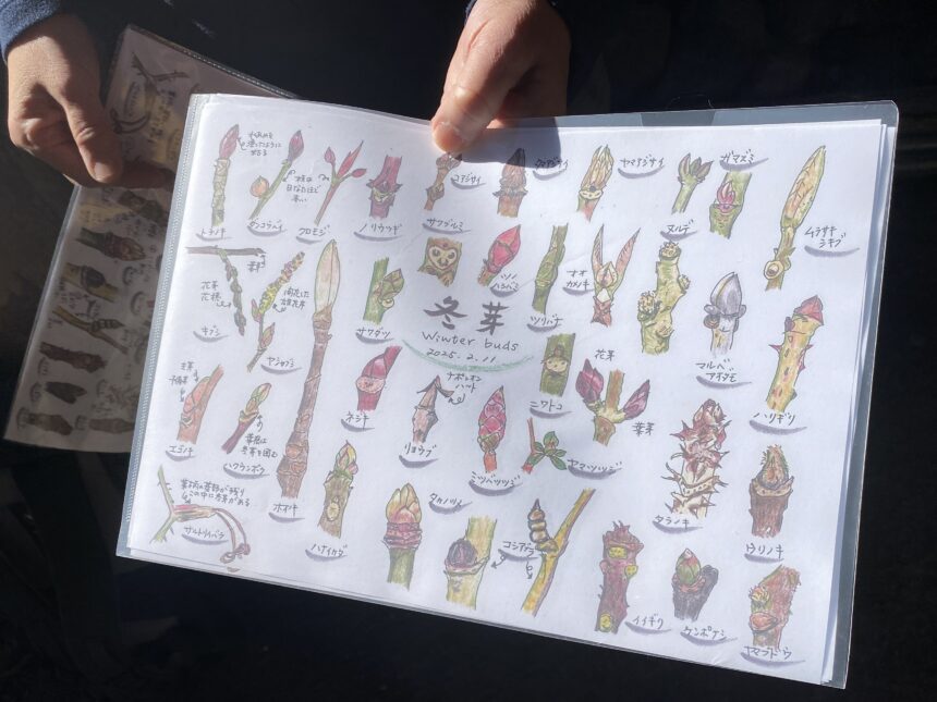 最初に、様々な冬芽たちがずらりと描かれた真佐代さんの手描きの資料と虫眼鏡が配られました🔍