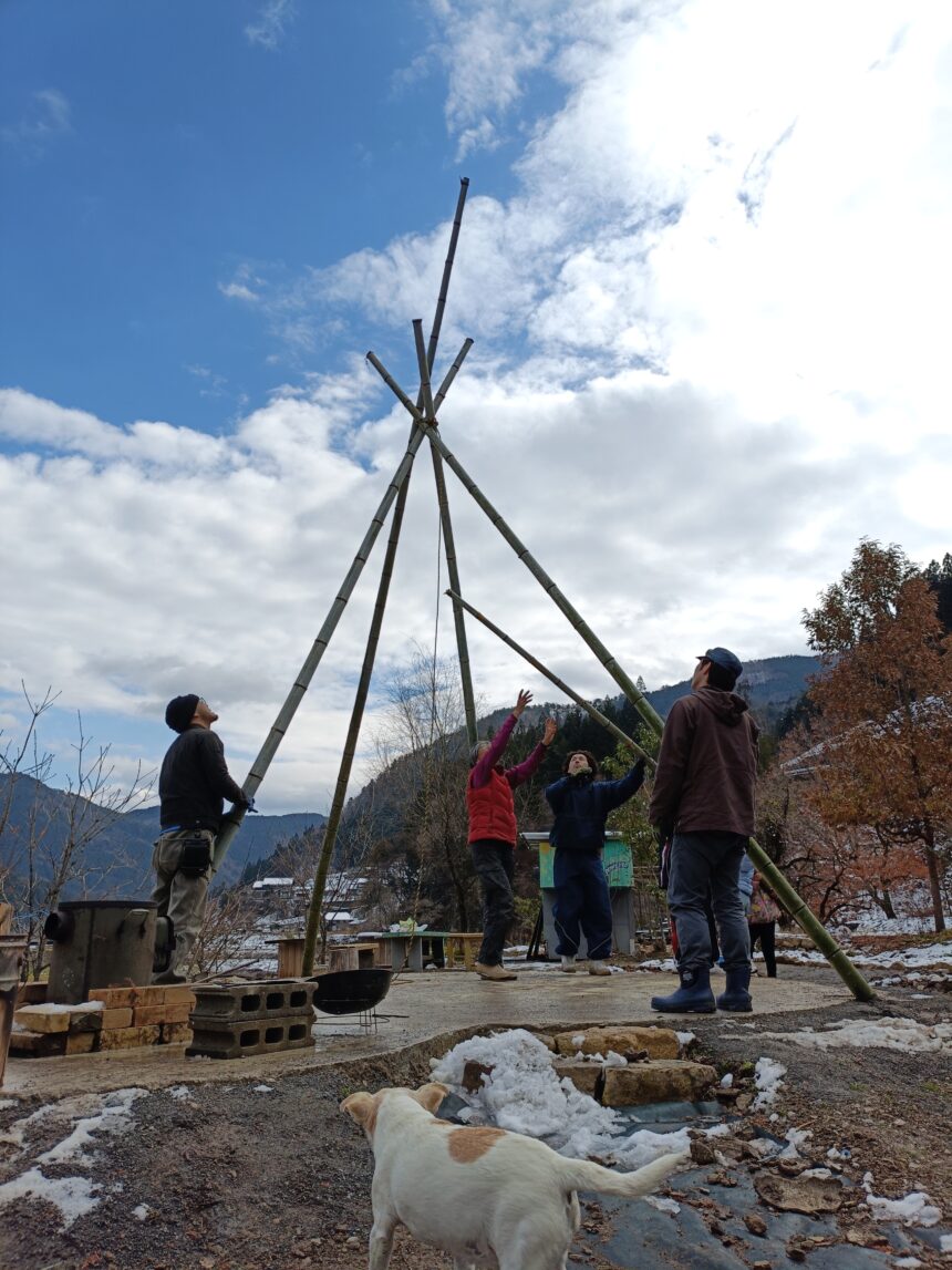 なるほど!こんな感じだな!というイメージがつかめたところで、一度竹を下ろして、てっぺん部分にひもで固定します。
