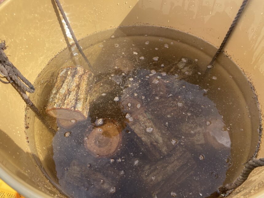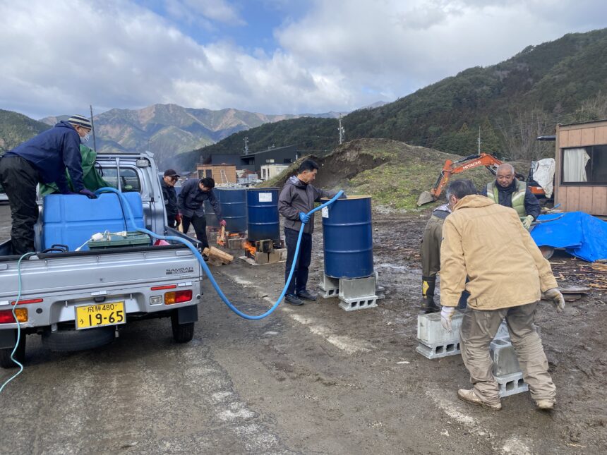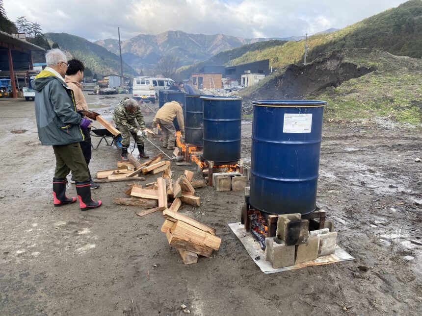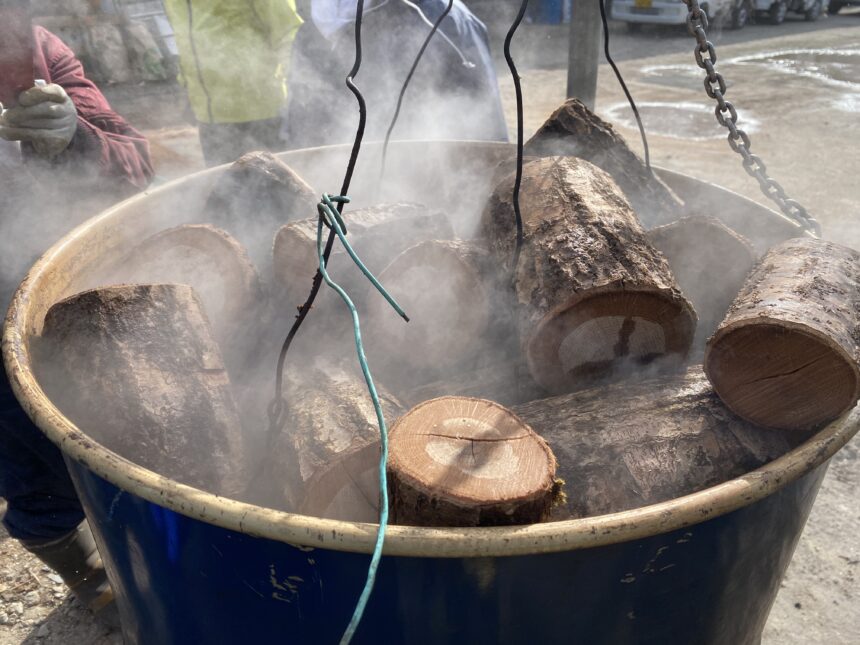 ドラム缶の温泉の中に原木を沈めてグツグツ煮込むこと4時間以上♨️
