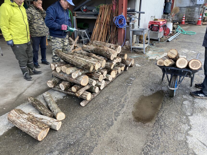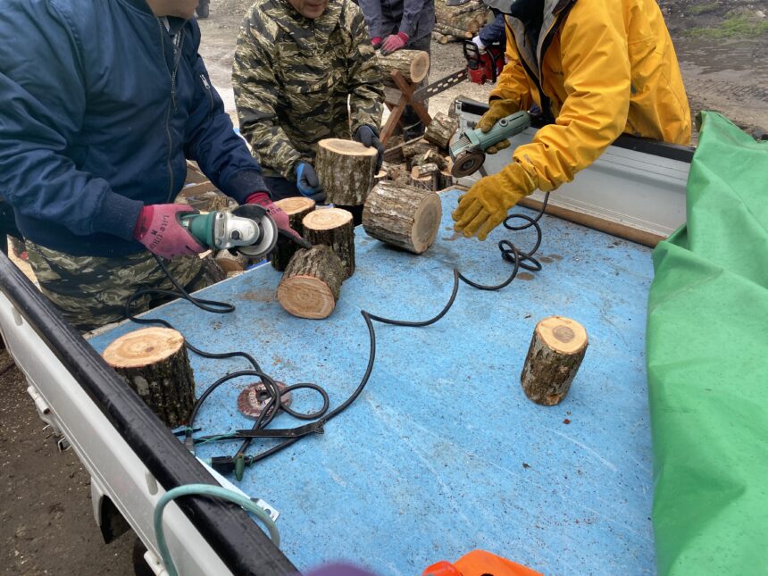 メンバーさん達によって綺麗に切り分けられたナラの原木に、みんなで手分けして種駒菌とオガクズ菌の打ち込みを行いました🪵🔨