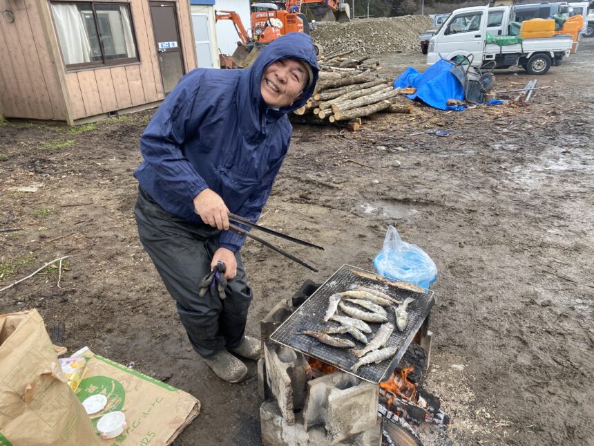 原木がゆっくり温泉に浸かっている間に、メンバーの方が養殖されているあまごの塩焼きを焼いてくださいました😍