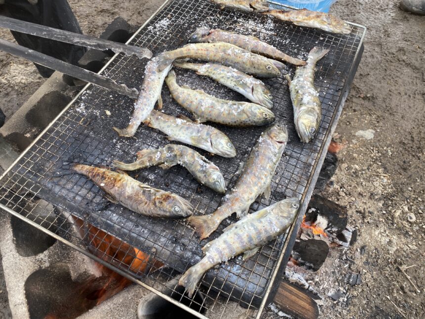 そして…同イベント恒例!!『きのこの山づくり』名物10時のおやつのあまごの塩焼き🐟✨