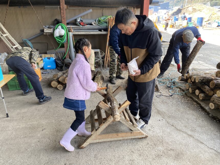 仲良くきくらげの菌打ちをしている親子さん🪵🔨