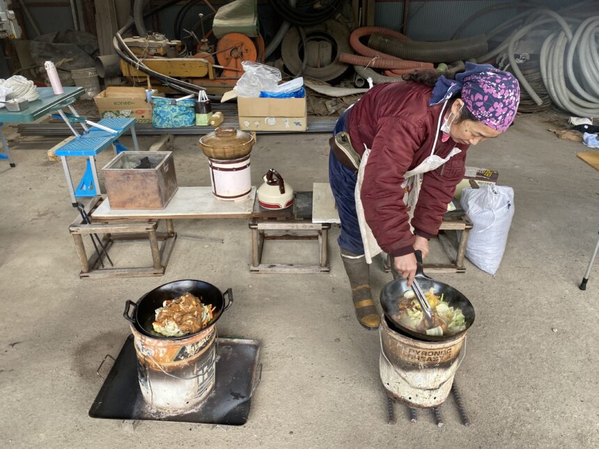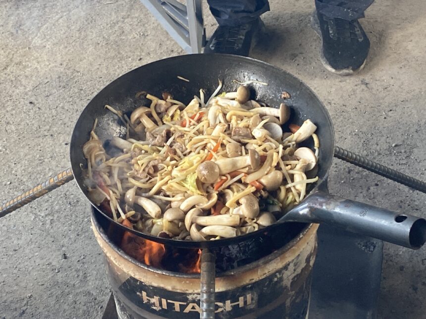 原木たちが4時間以上の長風呂に浸かっている間に、青空クッキングでテキパキと25名分の昼食を準備する女性メンバーさん🍳