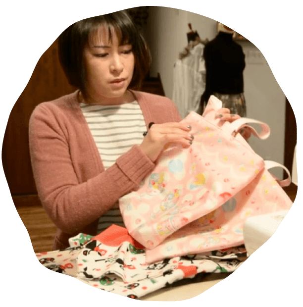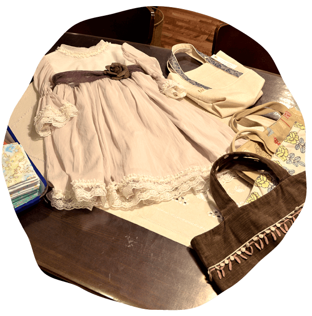 その日を境に向野さんの手から、子どものための発表会ワンピースやバック、アームカバーと、いろんなものが生まれました。それを見たほかのお母さんたちからバッグやエプロン、巾着などの依頼が舞い込むようになりました。